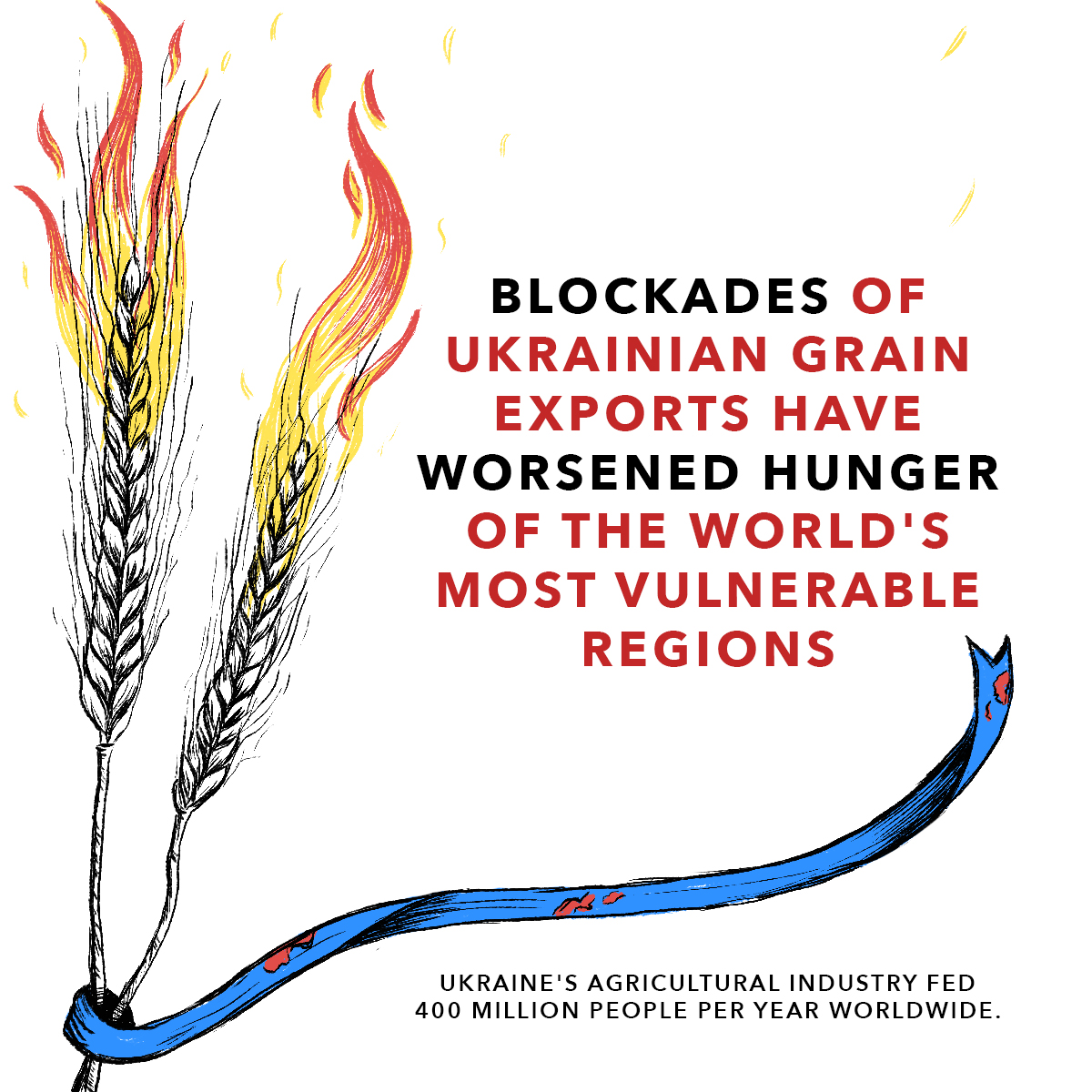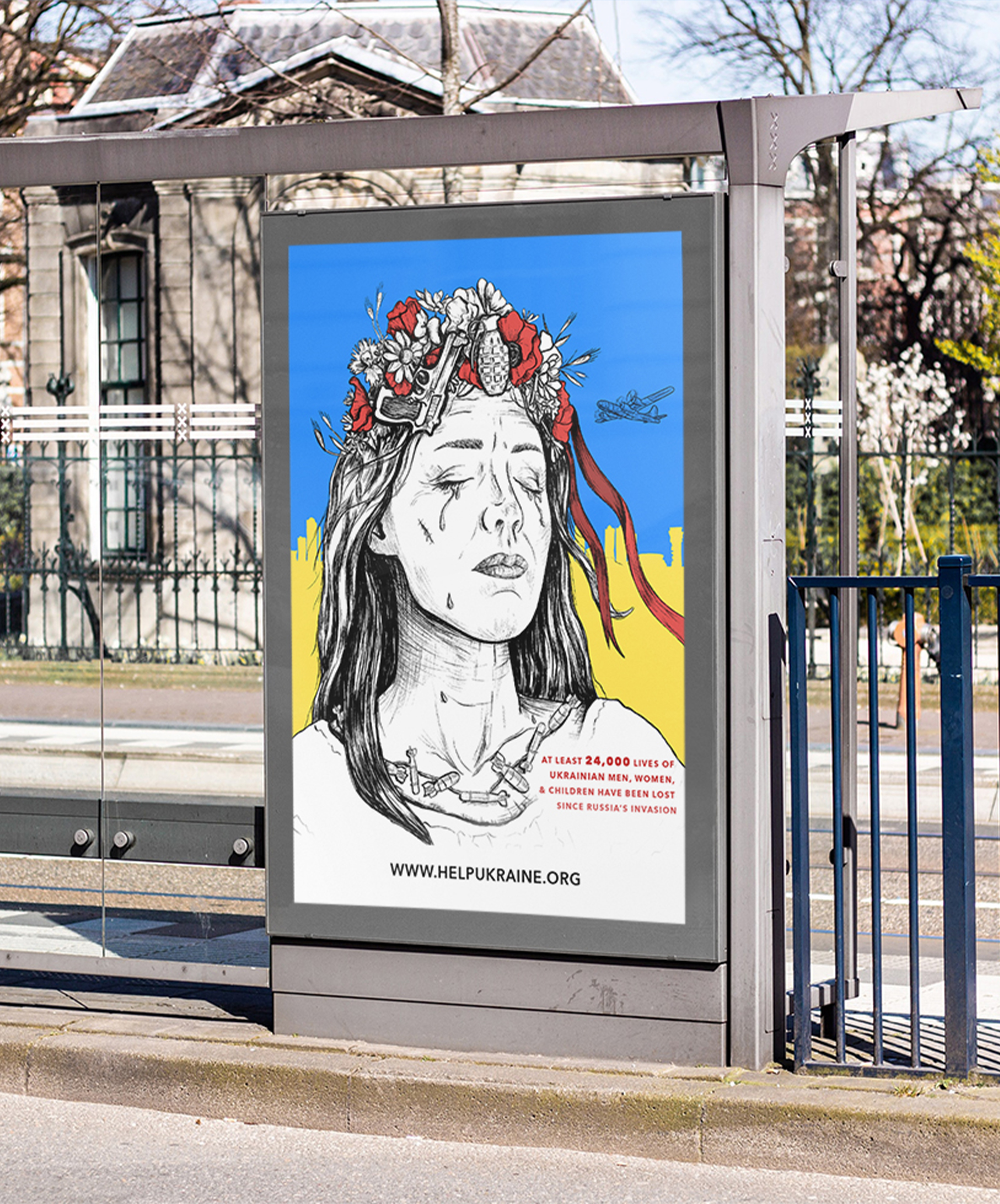 A campaign to raise awareness about what is happening and asking for help on behalf of Ukrainian people through Help Ukraine, a non-profit orgazation. The design combines symbols and has a restricted color palette. Ukraine is often associated as a young lady/country and here she is portayed wearing a traditional wreath (vynok) hurt and praying for those affected by the war. The background is created using the Ukrainian flag colors as well as red; poppies representing consolation, remembrance, and death.